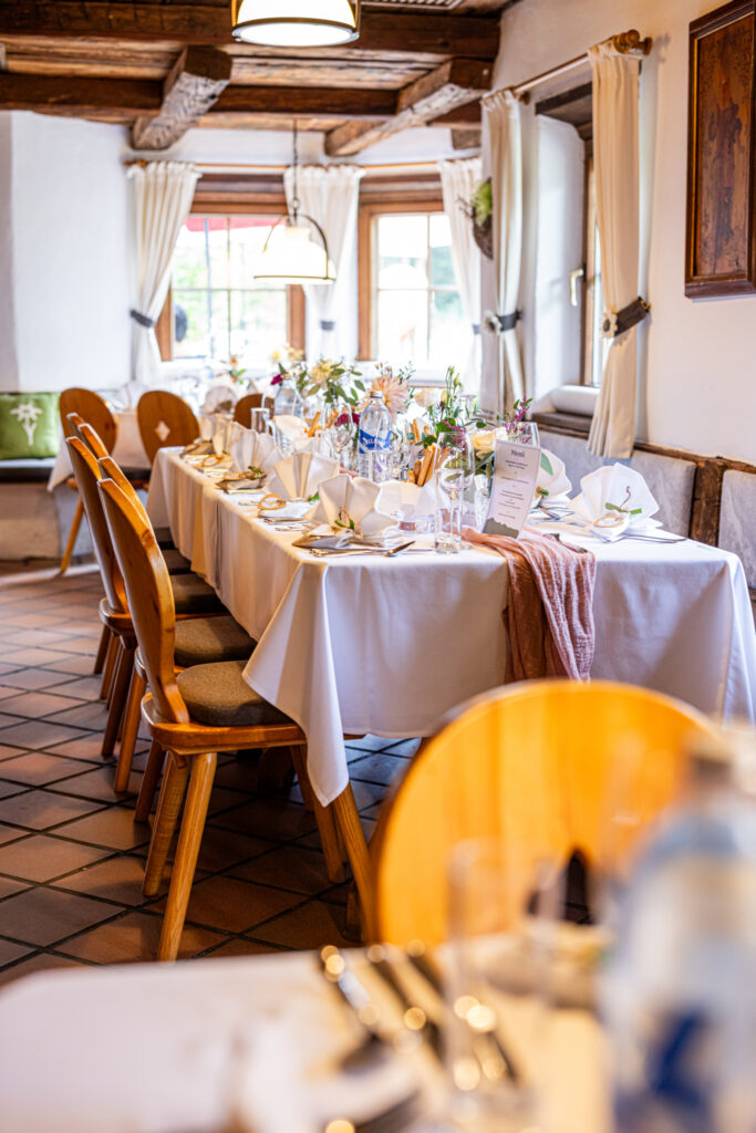 Feiert euren großen Tag inmitten von Wald und Wiesen. Unsere Stuben bieten Platz für bis zu 100 Gäste, während die Panoramaterrasse die Mieminger Kette zum Greifen nah erscheinen lässt. Aperitif auf der Terrasse bei Sonnenuntergang und ein festliches Menü aus unserer Restaurant‑Küche machen dein Fest unvergesslich.